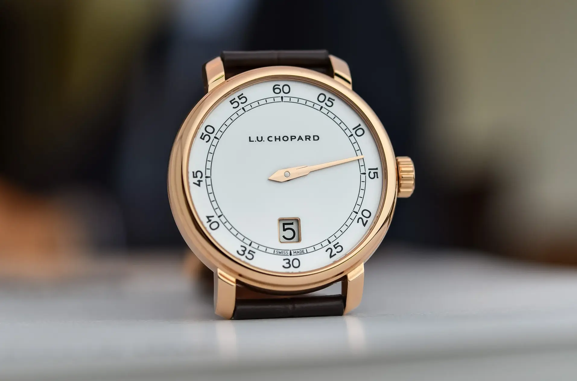 Четвертый пример - часы, которые уменьшают магию прыгающих часов до ее сути, с единственной золотой стрелкой для минут и прыгающими цифрами, видимыми через окно в 6 часов.