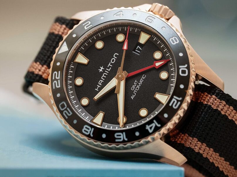 Стальная версия получила трёхзвенный браслет с тонкими полированными акцентами, бронзовая — ремешок NATO в полоску. Разница в цене минимальна: бронза традиционно дороже, но отсутствие браслета нивелирует разрыв. Обе модели остаются в числе самых доступных швейцарских GMT-хронографов.